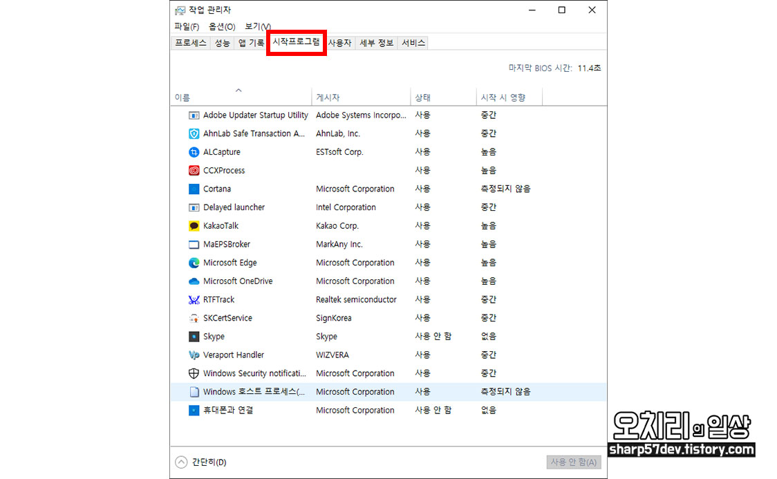 여기서도 PC를 느리게 하는 요소가 있을 수 있지만, 우리는 지금 "시작 프로그램"에서의 필요요소 검사를 하기 위해 알아보도록 하겠습니다.