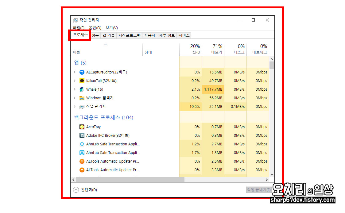 작업관리자 첫 페이지는 현재 실행되고 있는 애플리케이션들이 나타납니다.