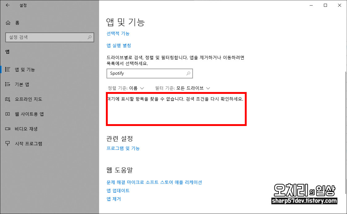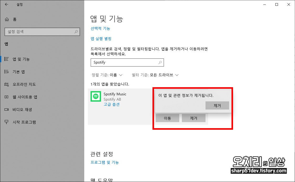 Spotify를 검색란에서 검색해서 찾아냅니다. 그리고 제거를 누르고 이 파일을 삭제합니다.
