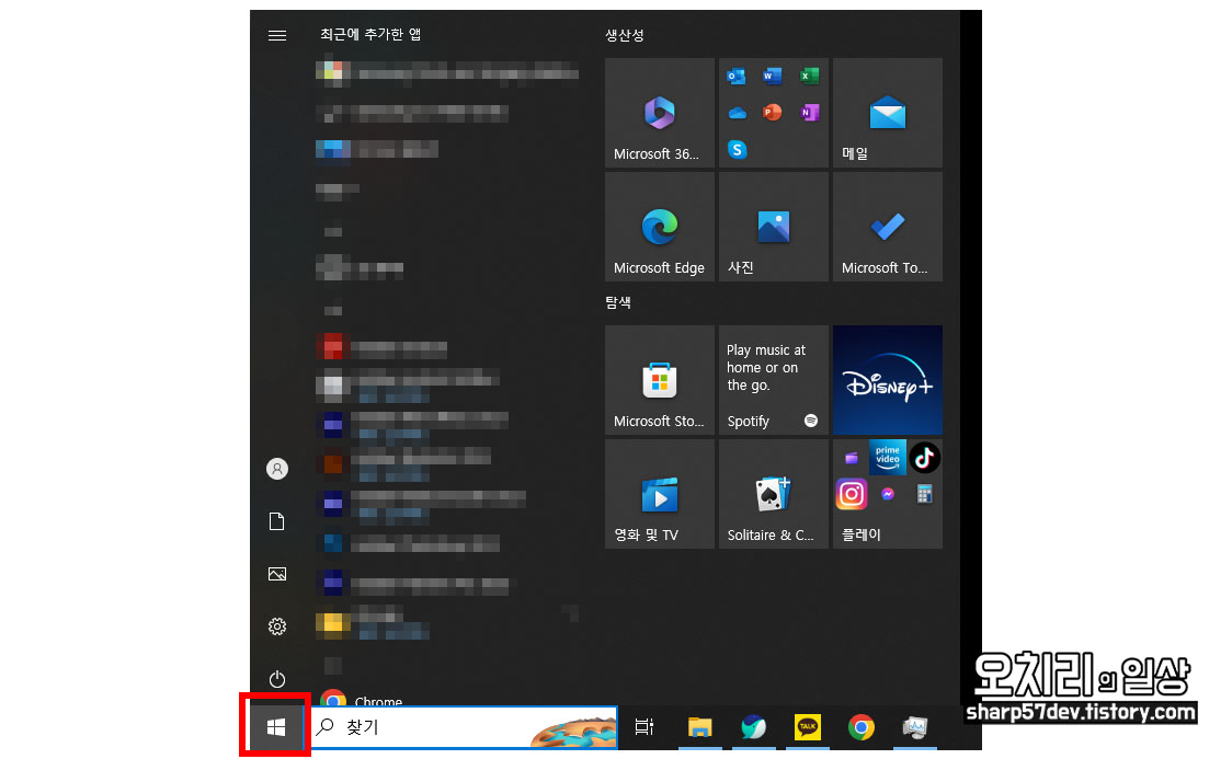 윈도우 화면 왼쪽 맨아래 "윈도우 키"를 누릅니다.