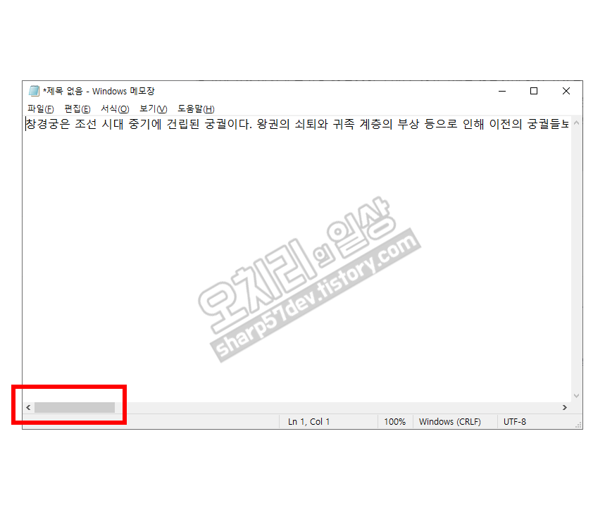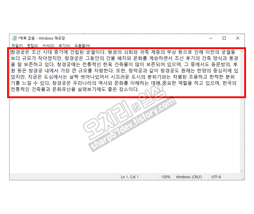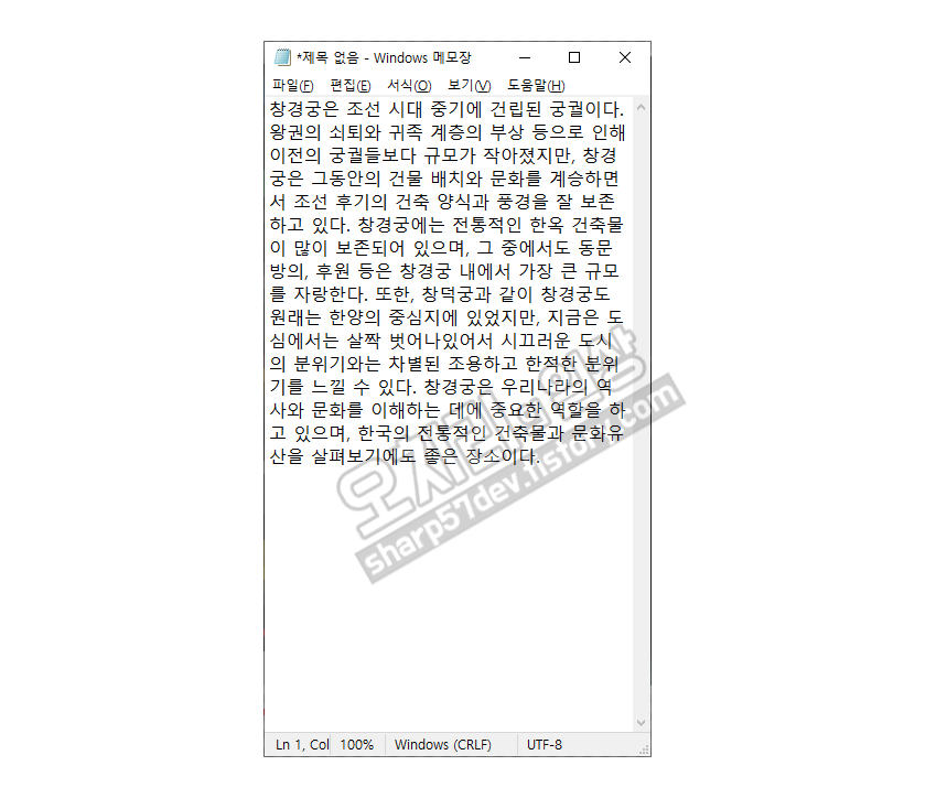 여기에 창경궁의 역사에 대한 글을 378자 정도의 글자수로 적어보았습니다. 하지만 역시나 그 긴 글이 메모장에서는 한 줄로 길게 쓰여서 한눈에 읽을 수가 없는 가독성이 떨어집니다.