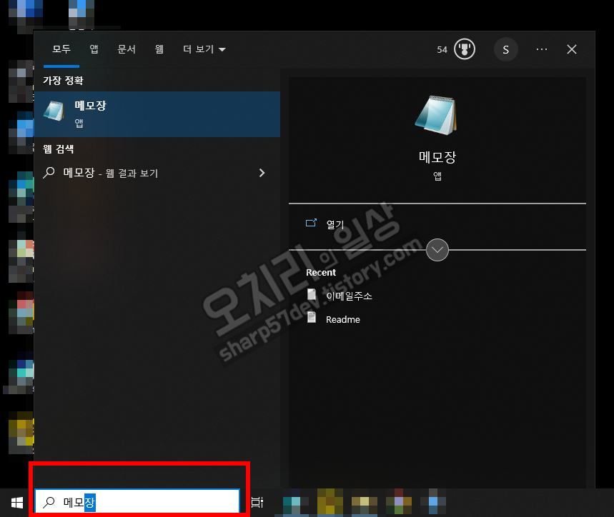 찾기 검색란에 "메모장"이라고 입력을 합니다.