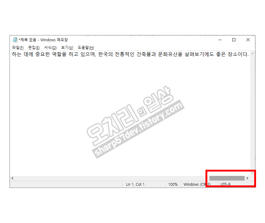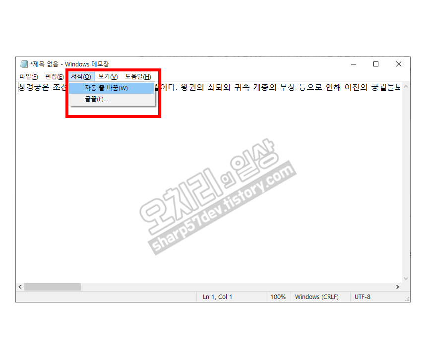 그럼 이제 메모장 창 밖으로 글이 안 넘어가고 자동개행(자동 줄 바꿈)에 대해서 알아보겠습니다.