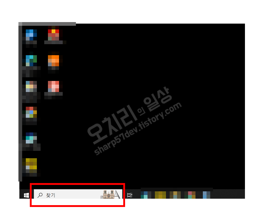 윈도우 화면 왼쪽 아래 찾기 칸이 있습니다. 여기로 마우스 왼쪽 클릭으로 포커스를 맞춰주십니다.