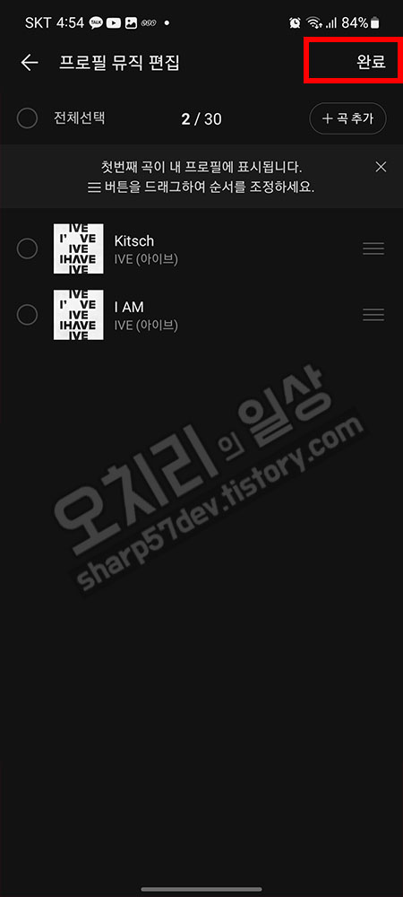 아래 "추가하기"버튼을 눌러 프로필에서 출력될 노래리스트를 저장합니다.