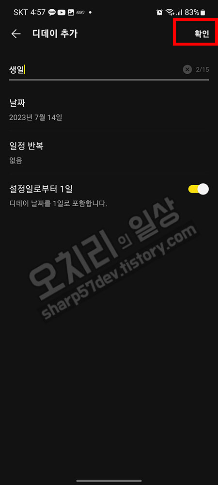 디데이 이름과, 날짜를 설정하고 오른쪽 위에 "확인"버튼을 클릭하여 디데이를 저장하고 프로필 화면으로 돌아옵니다.