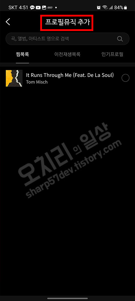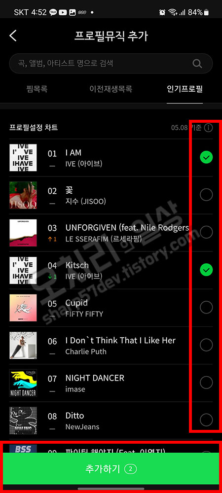 저는 프로필뮤직 추가에서 "프로필설정 차트"에서 "인기프로필"메뉴를 선택하여 원하는 곡을 오른쪽 선택란에서 선택하여