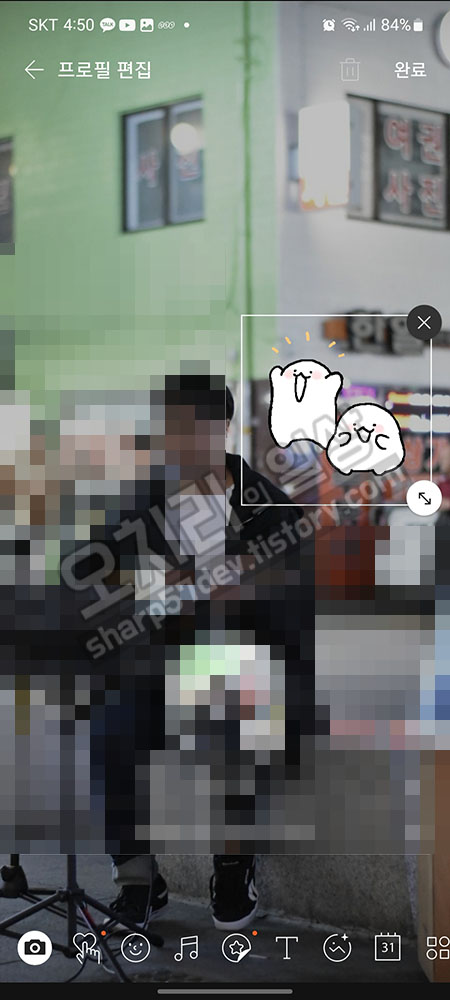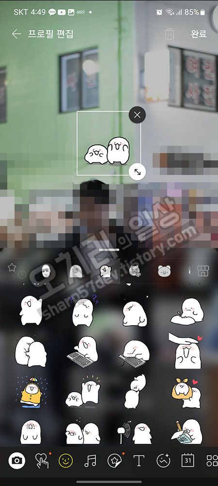 꾸미려고 선택한 이모티콘의 크기를 키워봤습니다. 큼직막하니 톡 할 때보다도 훨씬 크게도 크기 조절이 가능해서 기분이 좋았습니다.