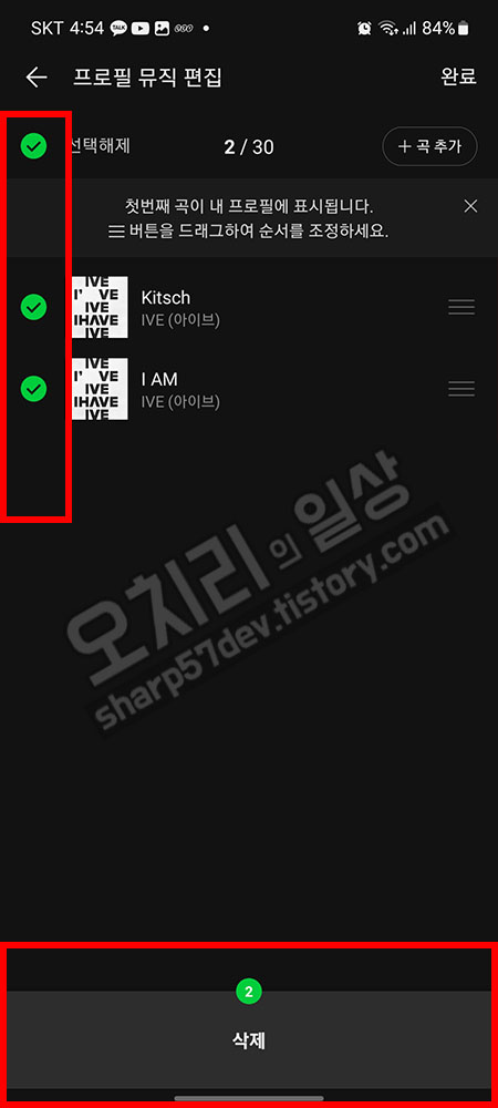이번에는 반대로 노래를 삭제할 때는 왼쪽에 체크를 한 후 아래버튼에 "삭제"버튼을 누르면 삭제가 됩니다.