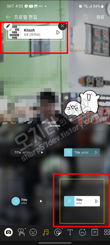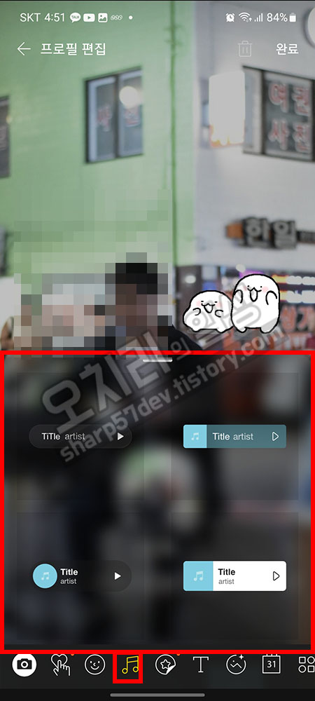 이번에는 프로필에 뮤직을 넣어 BGM을 넣어보겠습니다. 방금 사용했던 이모티콘 바로 오른쪽에 있는 음악 아이콘을 클릭합니다. 뮤직 위젯들이 화면에 펼쳐집니다. 어떤 위젯을 사용할지 선택하면 프로필 화면에 출력됩니다.