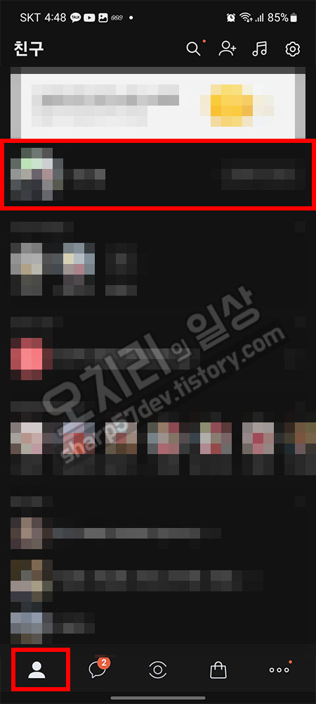 카카오톡을 실행하고 하단의 다섯개의 메뉴 중 처음에 있는 카톡 주소록인 사람 아이콘을 클릭합니다.