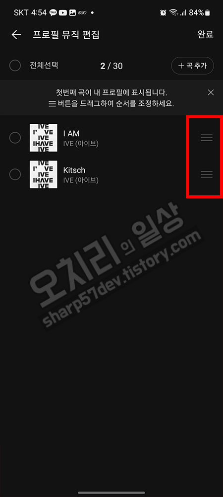 노래 순서를 정하고 싶을때는 오른쪽 빨간 네모 안의 짝대기 세 개짜리를 눌러 위아래로 이동시키면 노래 순서를 정해 플레이할 수 있습니다.