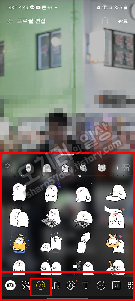 그럼 이모티콘으로 제 프로필을 꾸며보도록 하겠습니다. 이모티콘으로 프로필 꾸미기는 유저가 이미 유료결제한 이모티콘만 사용이 가능했습니다. 이모티콘은 화면 하단에 큰 빨간 네모 안에 작은 빨간 네모로 표시한 스마일 아이콘이 이모티콘으로 꾸미기였습니다. 이것을 터치하고 이모티콘을 호출하여 꾸며보겠습니다.