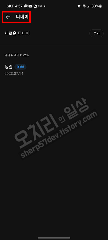 디데이 추가가 완료되었으면 "<-디데이"를 눌러 디데이 추가 화면을 나가 프로필 화면으로 돌아갑니다.