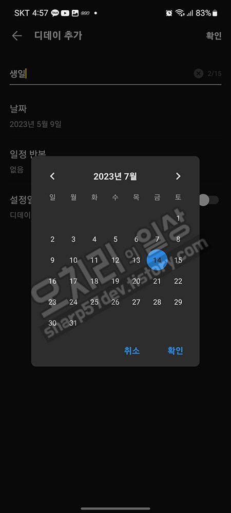 디데이를 달력에서 선택하고 기념일 이름을 입력합니다.