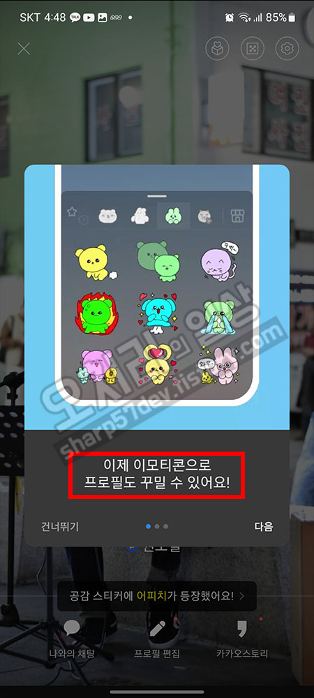 "이제 이모티콘으로 프로필도 꾸밀 수 있어요!"라며 이제는 프로필 꾸밀때도 이모티콘으로도 사용하여 꾸밀 수 있다는 가이드였습니다.