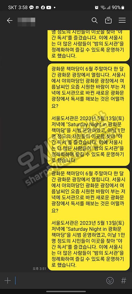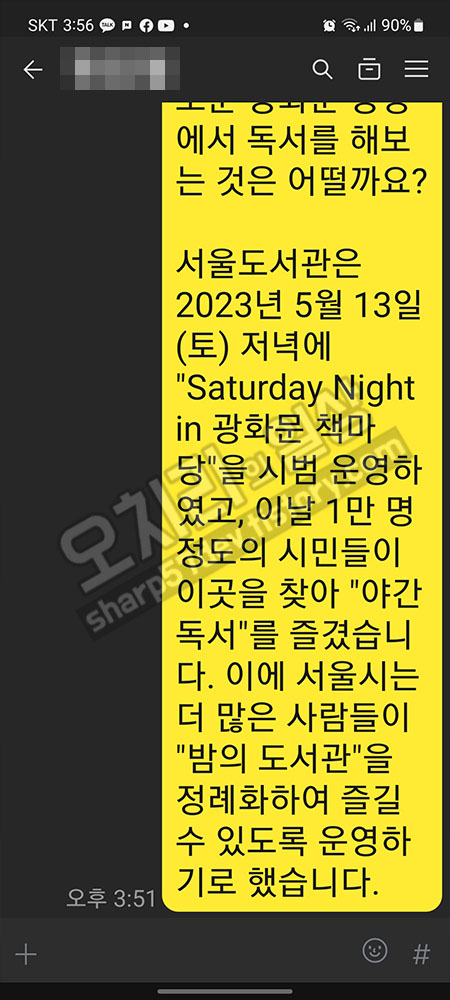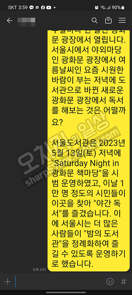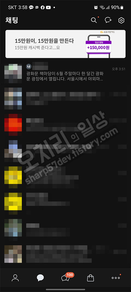 카카오톡을 실행합니다. 그리고 제 톡방으로 들어갑니다.