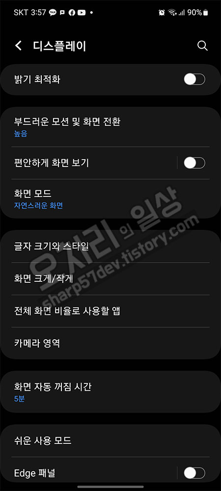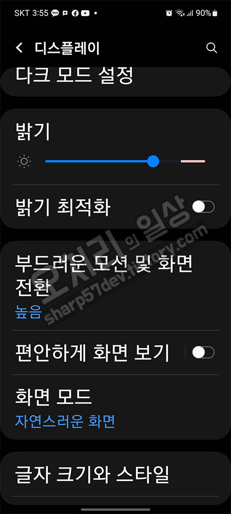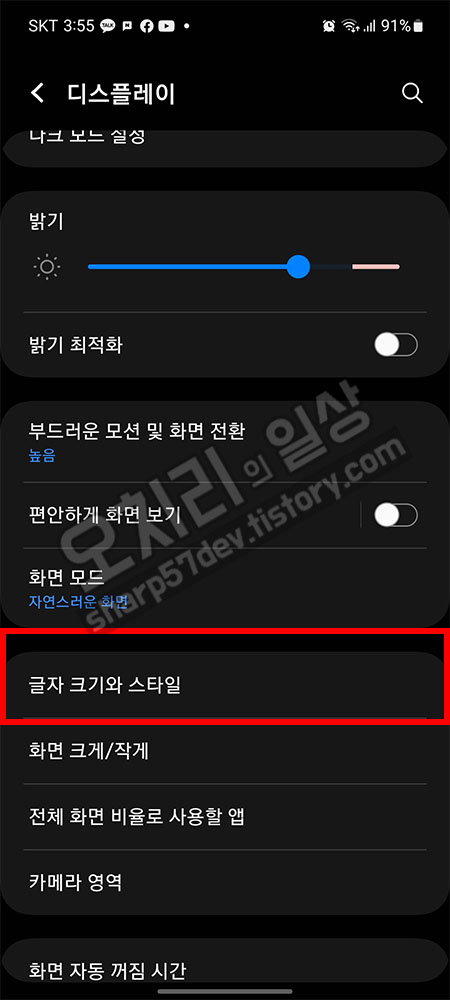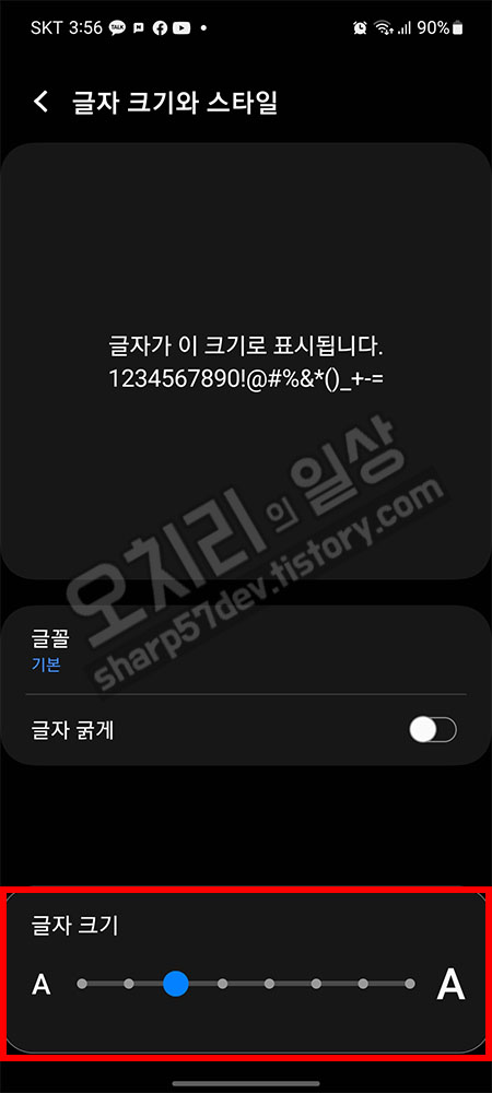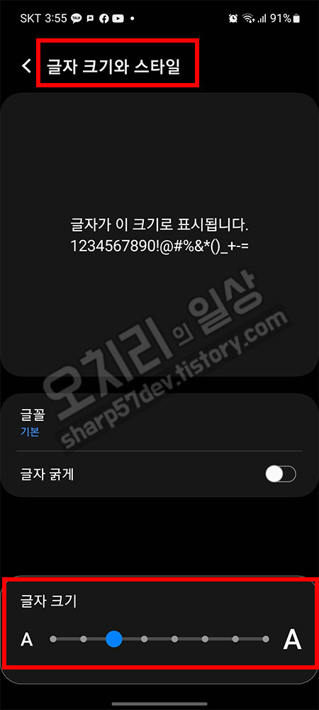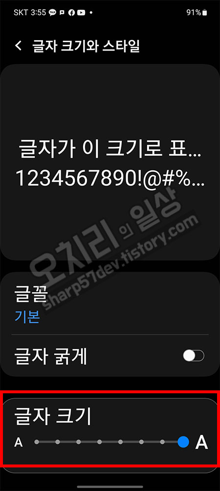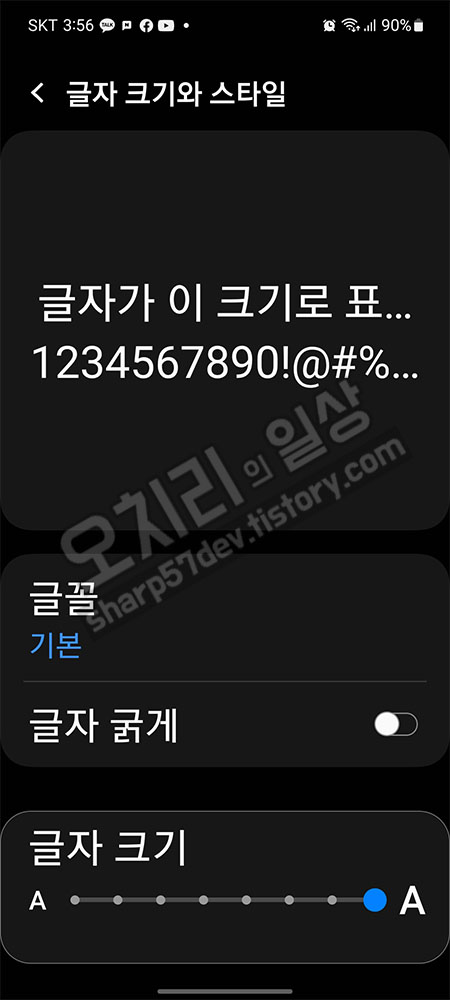다시 "설정 > 디스플레이 > 글자 크기와 스타일"에 진입하여 글자 그기를 제가 보기 편한 3번째 크기로 수정합니다.