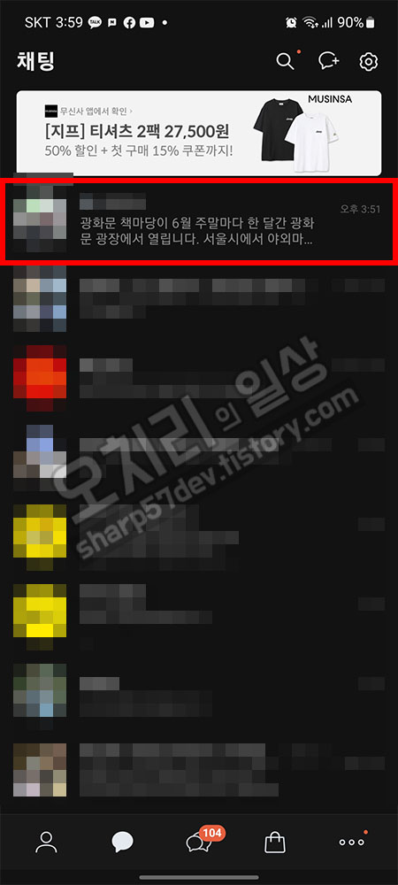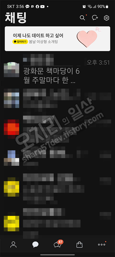그럼 이 전체설정 메뉴를 나갑니다. 채팅방 리스트가 나오고 제가 아까 글을 올려놓았던 제 톡방으로 들어가 보았습니다.