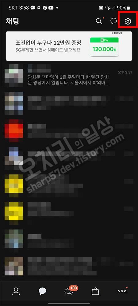 톡방을 나와 채팅방 리스트가 있는 곳에서 오른쪽 위에 톱니바퀴 모양의 아이콘을 터치합니다. 그리고 나타나는 메뉴 중 "전체 설정"메뉴를 터치합니다.