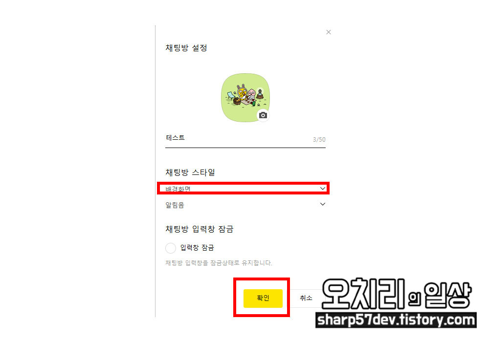 채팅방 설정 화면으로 진입합니다. 그 화면 중간쯤에 "채팅방 스타일 >> 배경화면" 메뉴를 클릭합니다. 배경화면을 선택하고 아래 "확인"버튼을 누르면 됩니다.