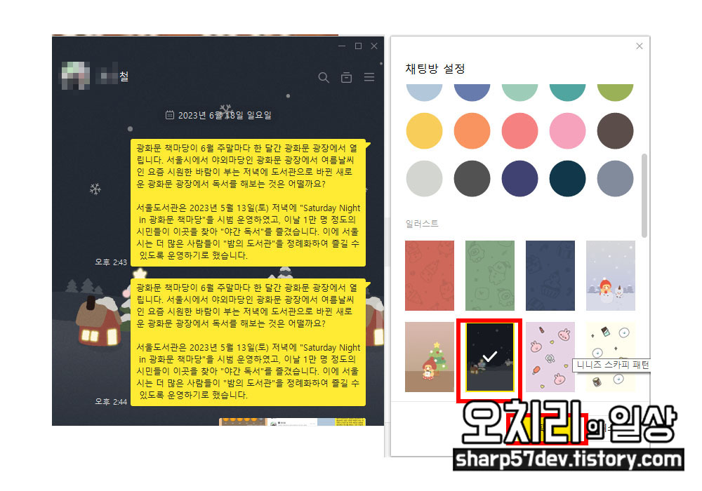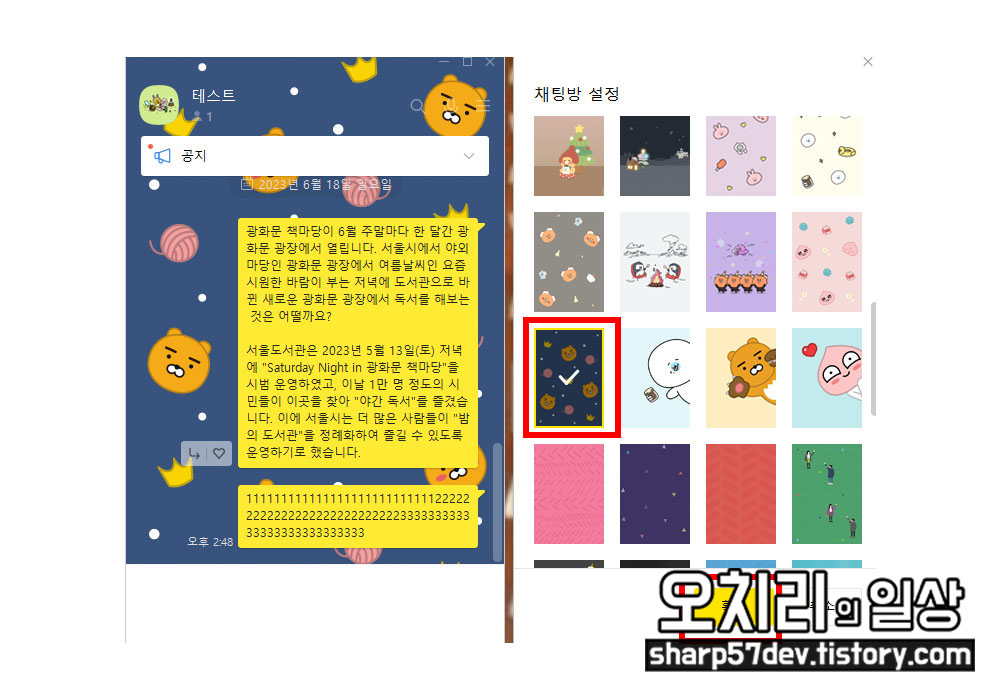 이렇게 위에서 선택했던 배경화면 색이 모든 채팅창에 통일되어 같은 배경화면임을 확인할 수 있습니다.