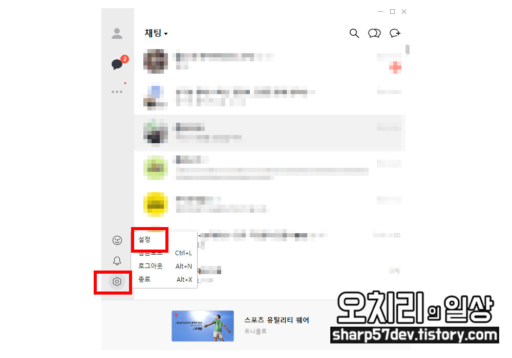 PC버전 카카오톡 본체화면으로 이동합니다. 왼쪽 아래 톱니바퀴 모양의 아이콘을 클릭합니다. 작은 메뉴가 나오고 "설정"이라는 메뉴를 선택합니다.