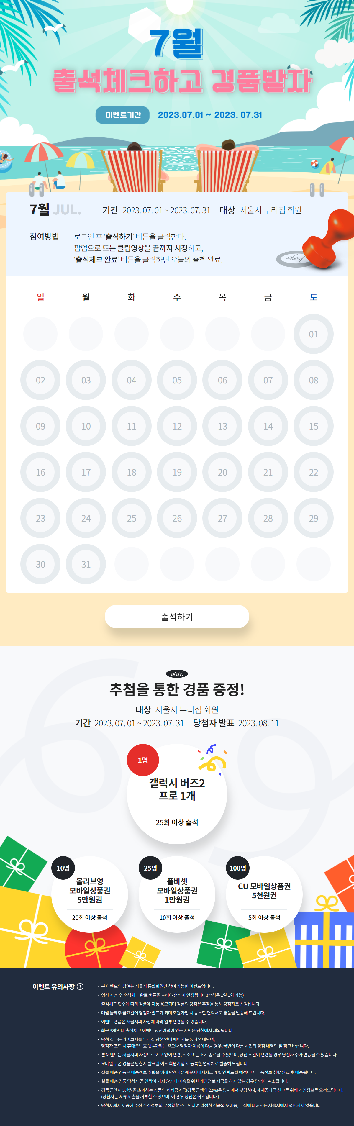 - 선정인원 : 5회 이상 출석 100명(5000원 모바일쿠폰), 10회 이상 출석 25명(1만원 모바일 쿠폰), 20회 이상 출석 10명(5만원 모바일쿠폰), 25회 이상 출석 1명( 갤럭시 버즈2 프로) - 출석체크 횟수에 맞는 대상 무작위 추첨합니다.