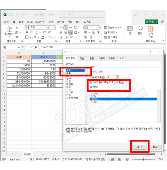 그리고 오른쪽에 "1000 단위 구분 기호 사용"을 체크합니다.