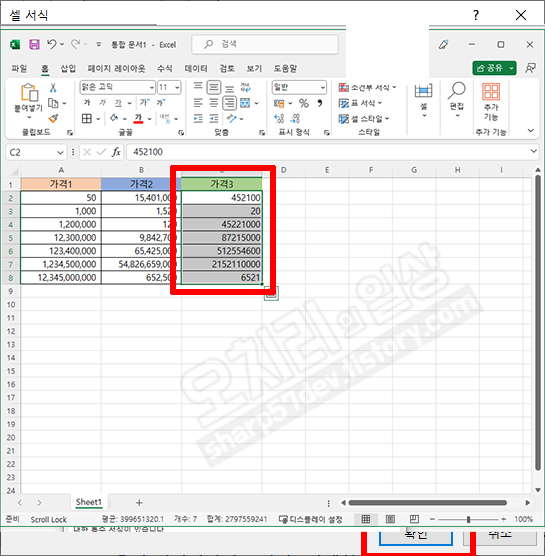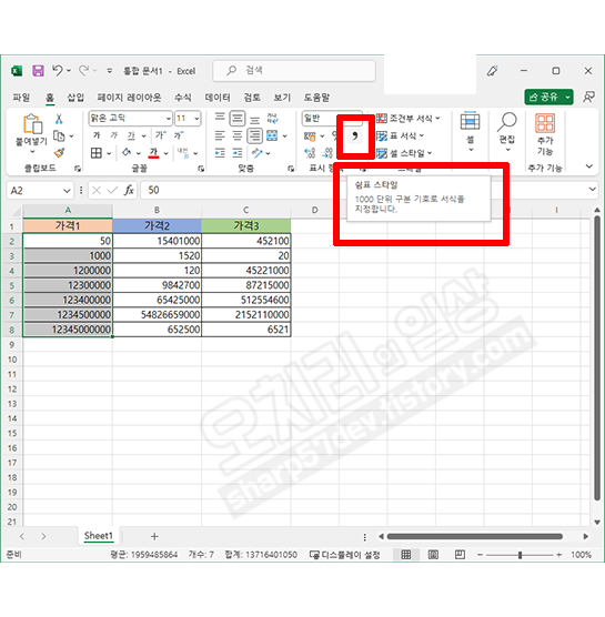그럼 "가격1"에 있는 숫자들이 1000 단위(3자리) 숫자마다 콤마(쉼표)가 입력되는 것을 보실 수 있습니다.