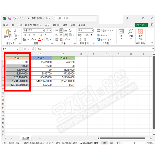 첫번째 열인 "가격1"에 포함된 숫자들에 적용해 보겠습니다.