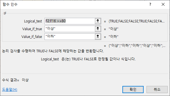 함수 인수 창으로 넘어가면 첫 번째 Logical_test에는 조건식, 그 아래에는 true일 때의 값, 또 그 아래의 값에는 false일 때의 값을 입력합니다. 그럼 조건식에 따라 결과값인 '이상' 또는 '이하'라는 값을 출력하게 될 것입니다.
