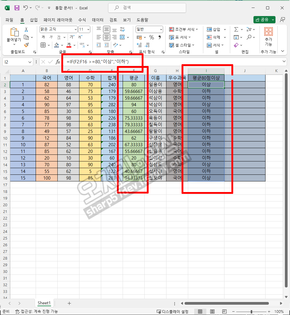 먼저 제가 임의로 엑셀에 학생들의 국어, 영어, 수학 점수와 총점, 평균을 구해놓았습니다. 이 총점, 평균 구하기는 아래 링크를 걸어 놓을 테니 그 게시물로 가보시면 총점과 평균 구하기 함수에 대해 알아보실 수 있을 것입니다.