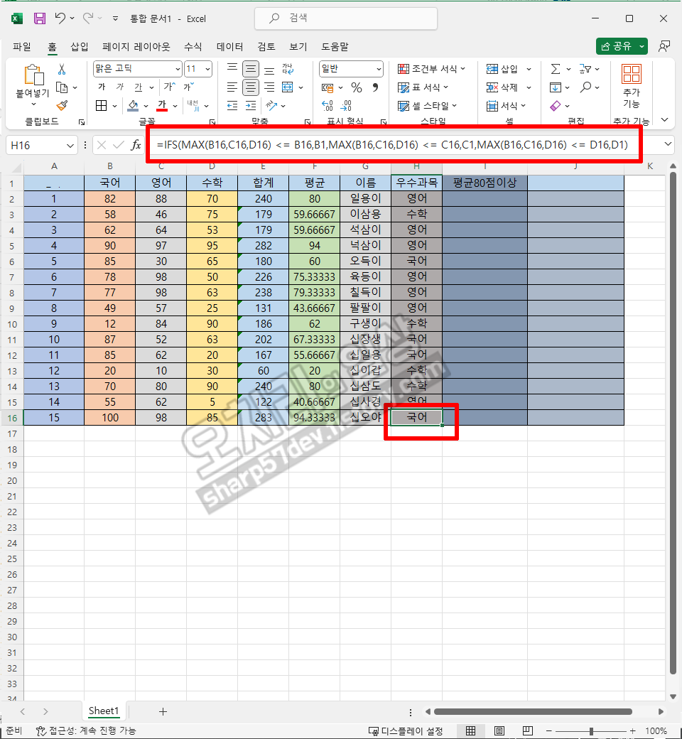 이번에 사용할 함수는 국, 영, 수 점수중에서 제일 점수가 높은 우수과목이 무엇인지 출력하도록 하는 함수입니다.