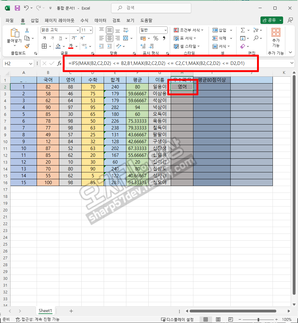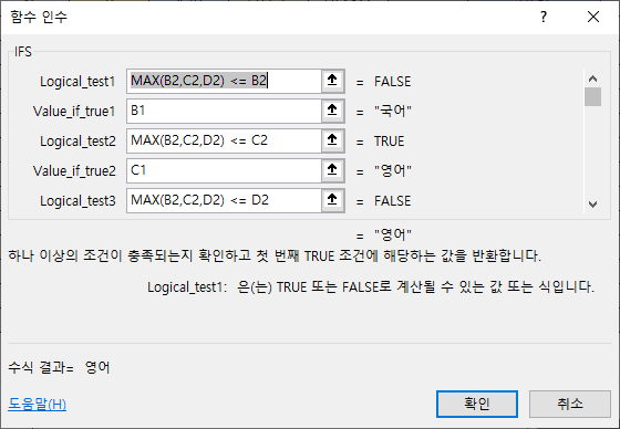 풀이하자면 - B2, C2, D2중에서 B2가 가장 크면 B1(국어), B2,C2,D2중에서 C2가 가장크면 C1(영어), B2,C2,D2중에서 D2가 가장크면 D1(수학)이 출력되는 식입니다.
