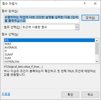 IFS(logical_test,value_if_ture,...) - 하나 이상의 조건이 충족되는지 확인하고 첫 번째 true 조건에 해당하는 값을 반환한다고 합니다.