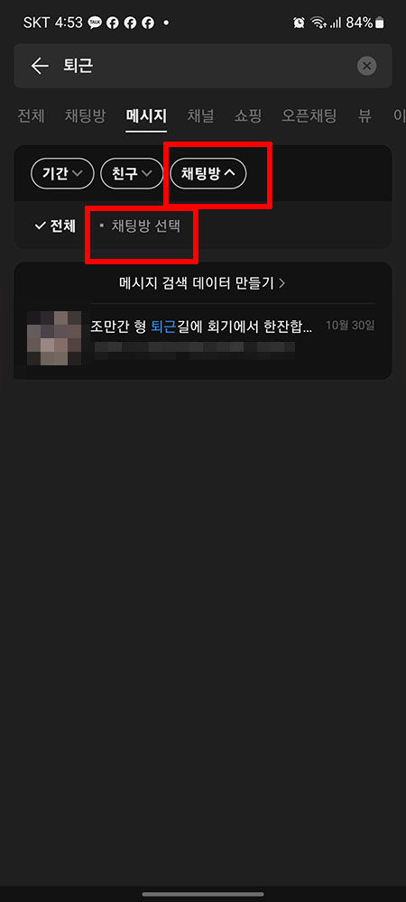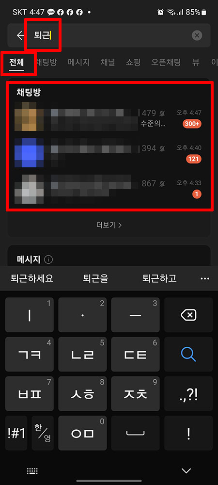 일단 메시지에서 검색하려고 '퇴근'이라고 검색하고 확인을 했지만, 검색은 그뿐 많이 아닙니다.