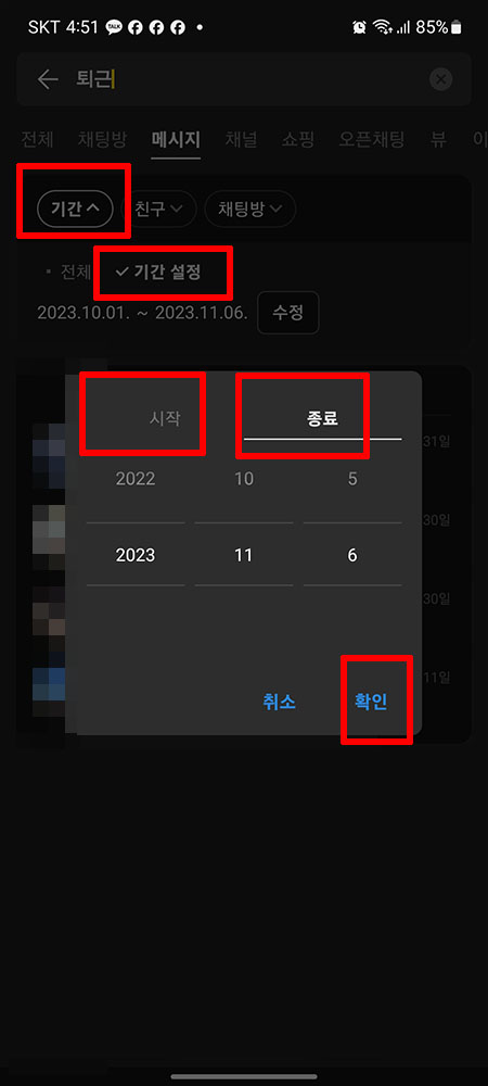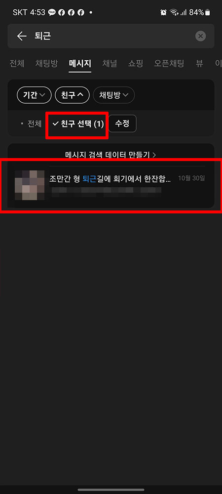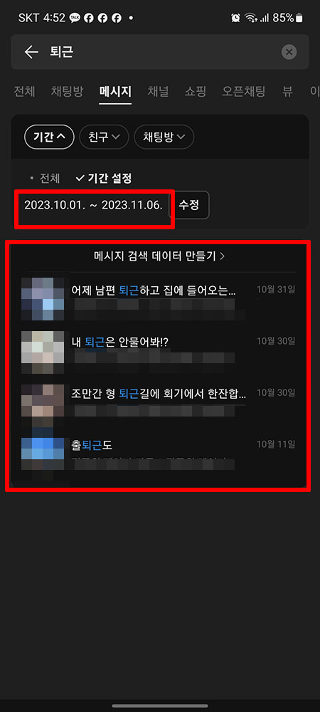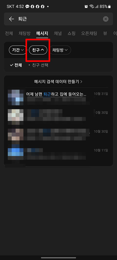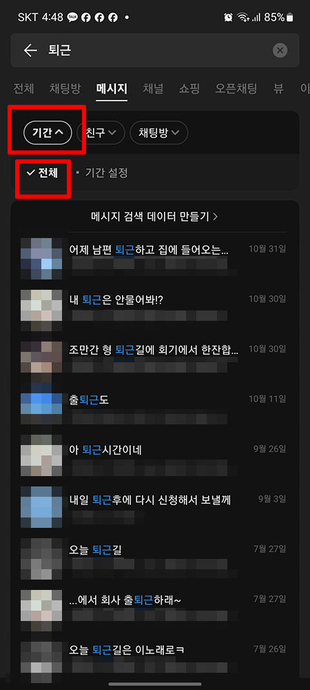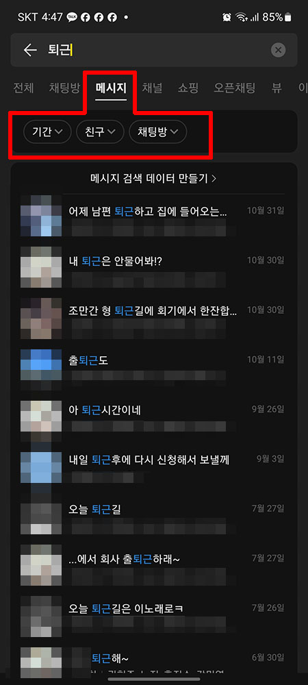 이번엔 '메시지의 기간/친구/채팅방'을 기준으로 검색을 해보겠습니다.