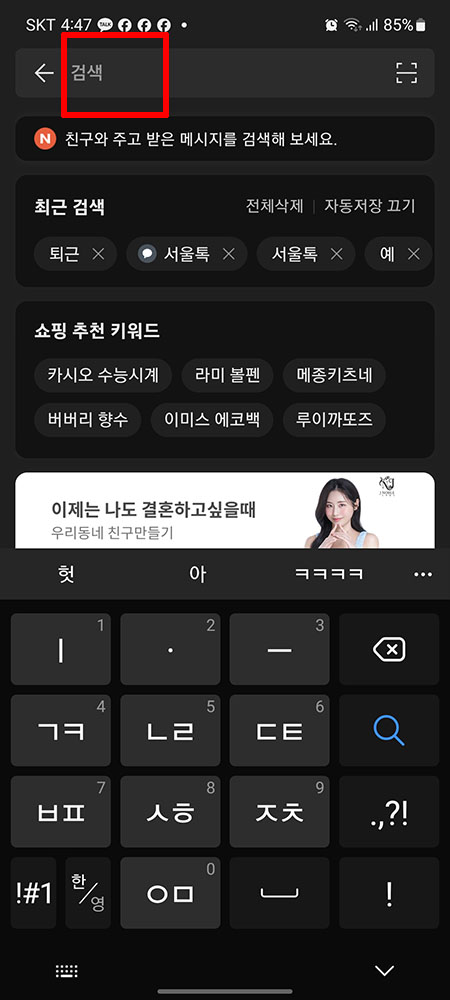 지금까지는 메시지에 대한 검색이었다면 이제는 메시지 외인 곳에서의 통합검색에 대해서 알아보겠습니다.