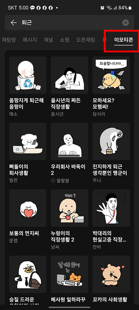 이렇게 '채팅방/메시지/채널/쇼핑/오픈채팅/뷰/이모티콘' 탭들에게서 검색 단어에 관련되고 속해있는 단어들이 모두 한 번에 검색이 되어 버립니다.