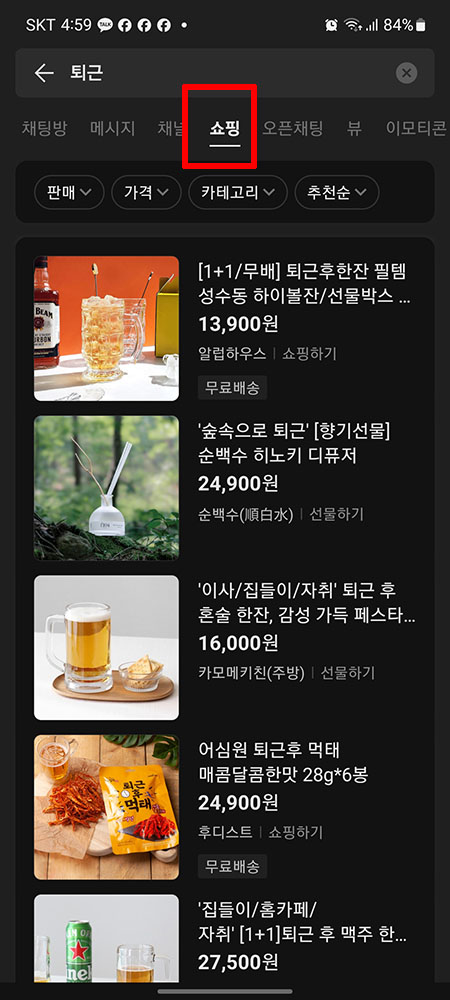 '쇼핑'탭에서도 검색단어로 같이 검색이 되며, 검색단어 '퇴근'이란 단어가 스며있는 쇼핑 상품도 검색이 되는 것을 볼 수 있습니다.