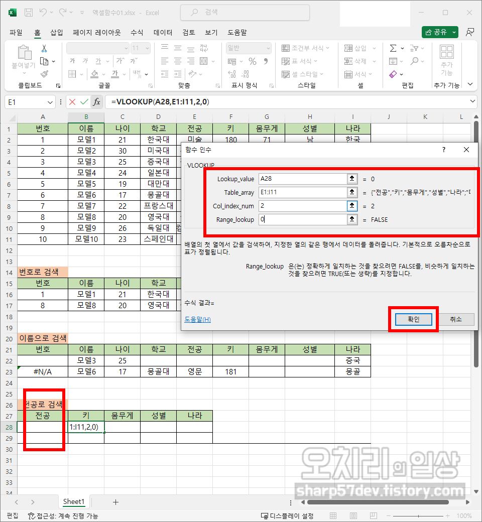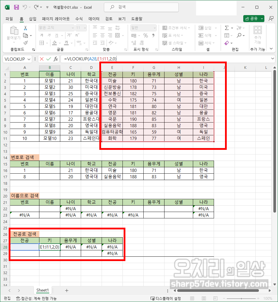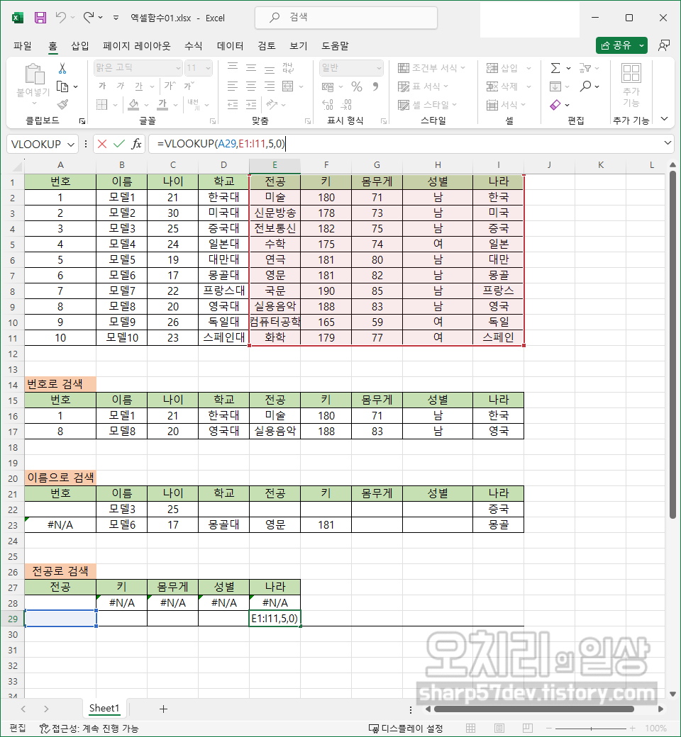 '나라(E28)'는 함수 fx=VLOOKUP(A28,E1:I11,5,0)