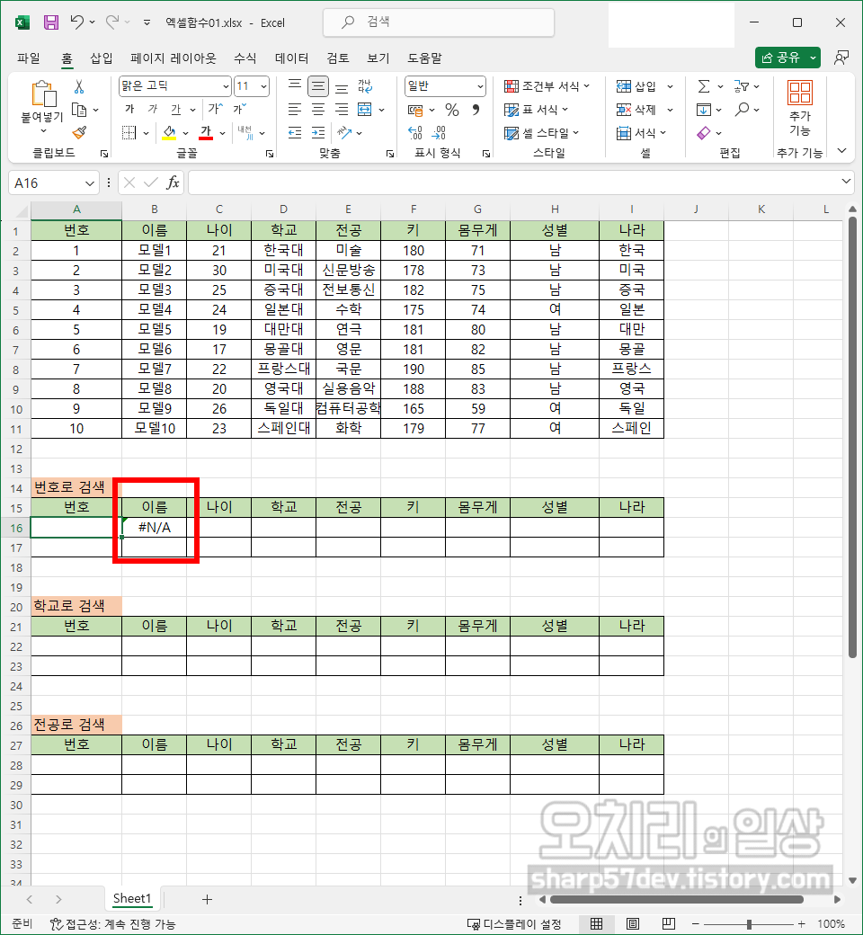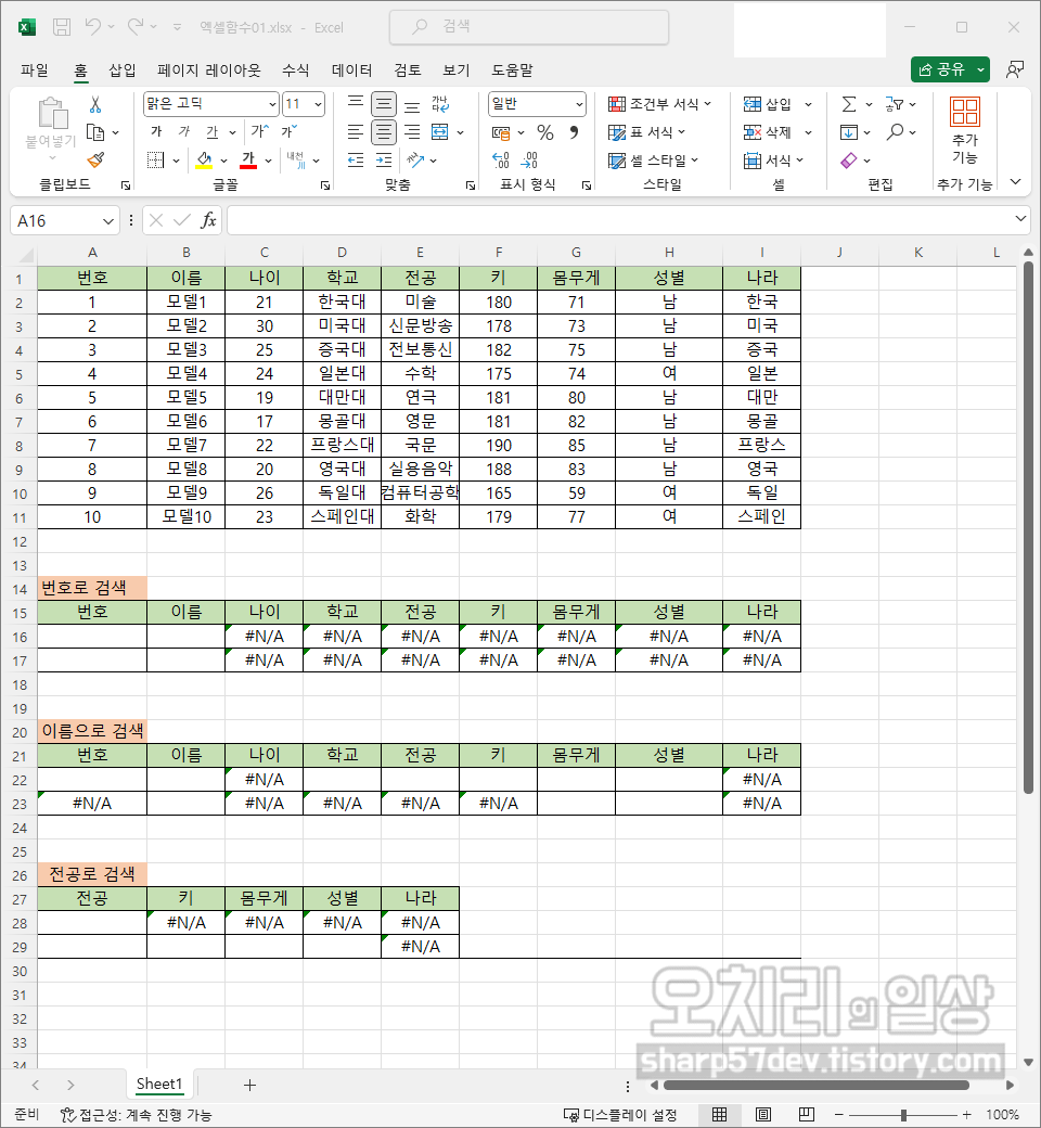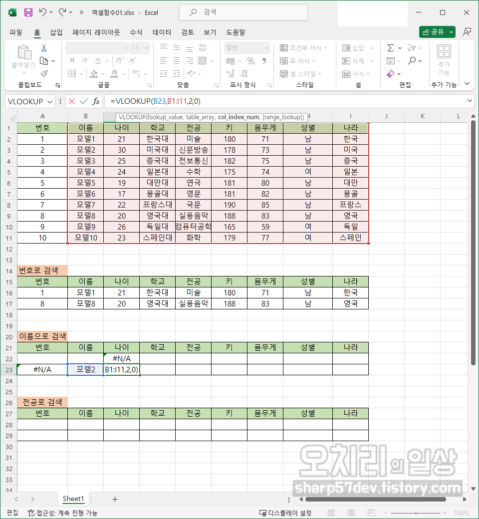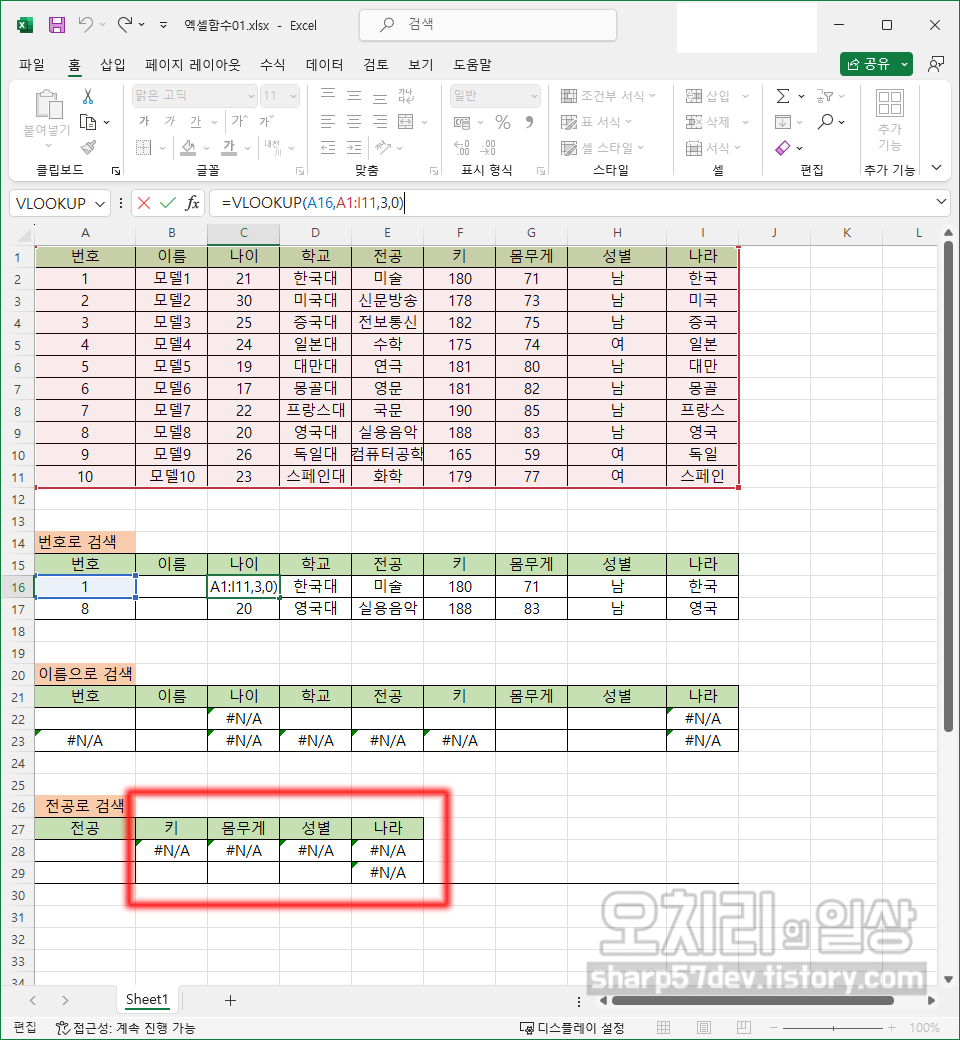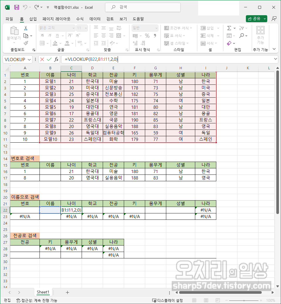 그럼 위와 같은 방식으로 이름/나이/학교/전공/키/몸무게/성별/나라칸에도 'VLOOKUP'함수를 사용하여 해당하는 값들을 입력합니다. 여기서의 '키워드'인 '번호'를 입력하기 전까지는 모두 '#N/A'로 표시됩니다.