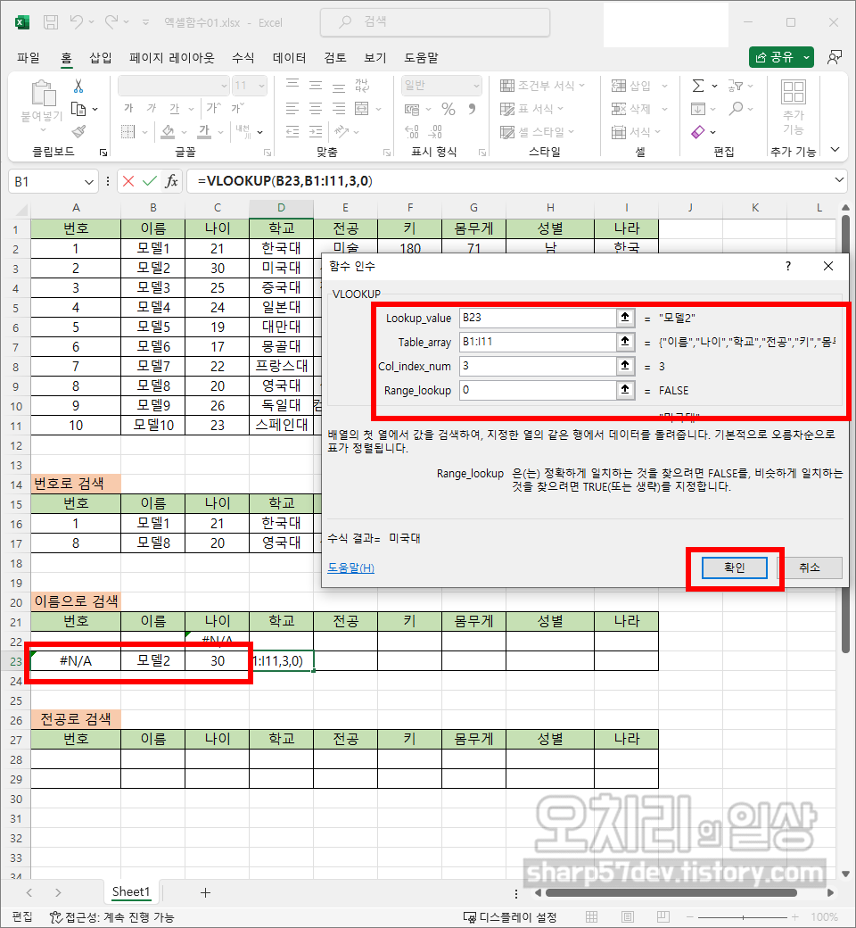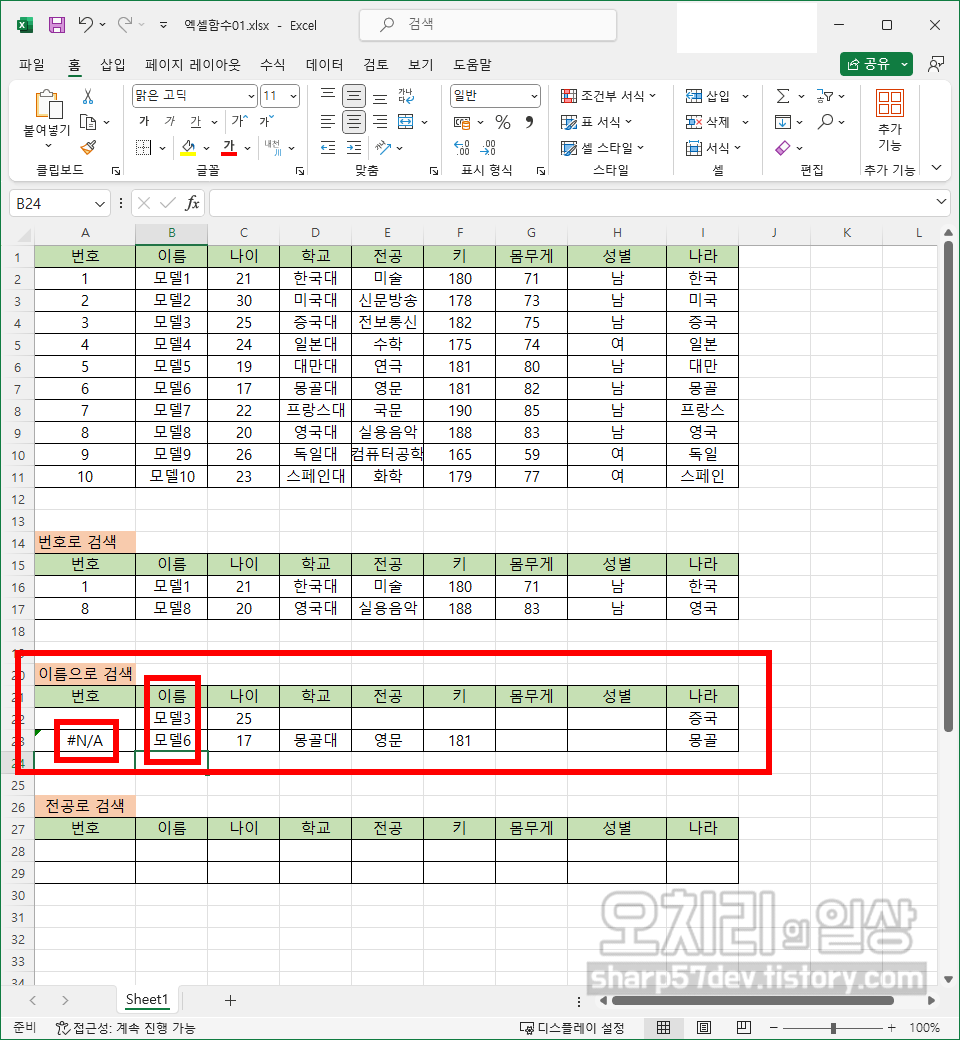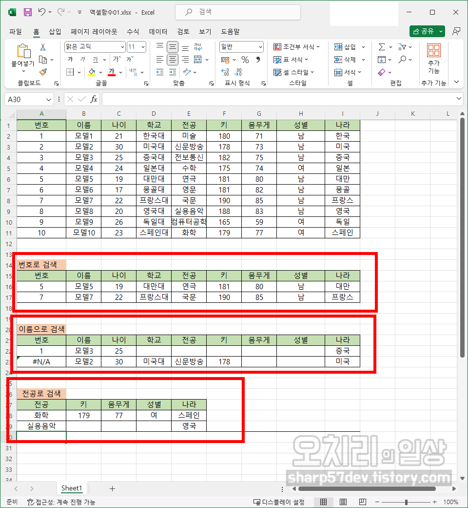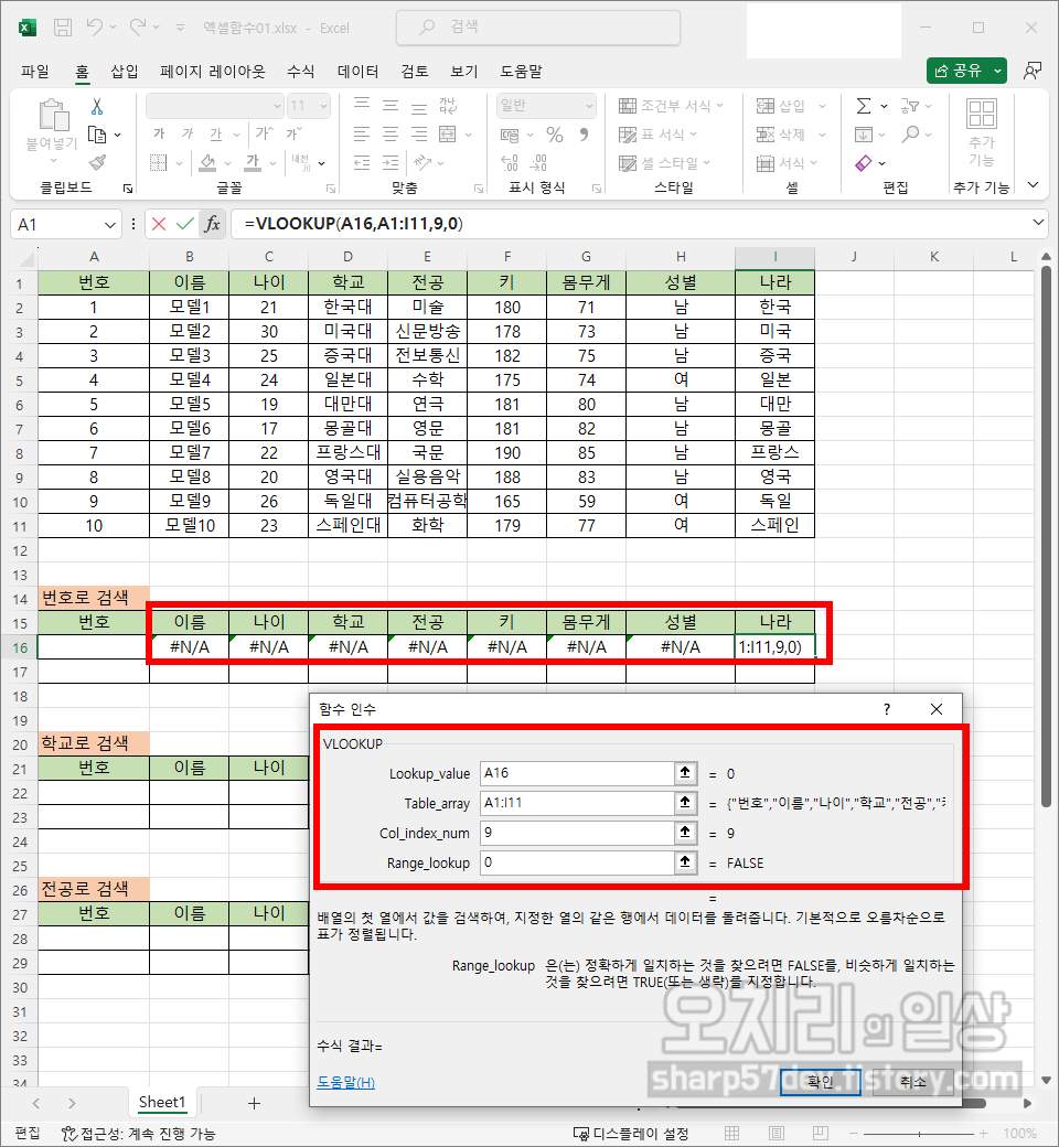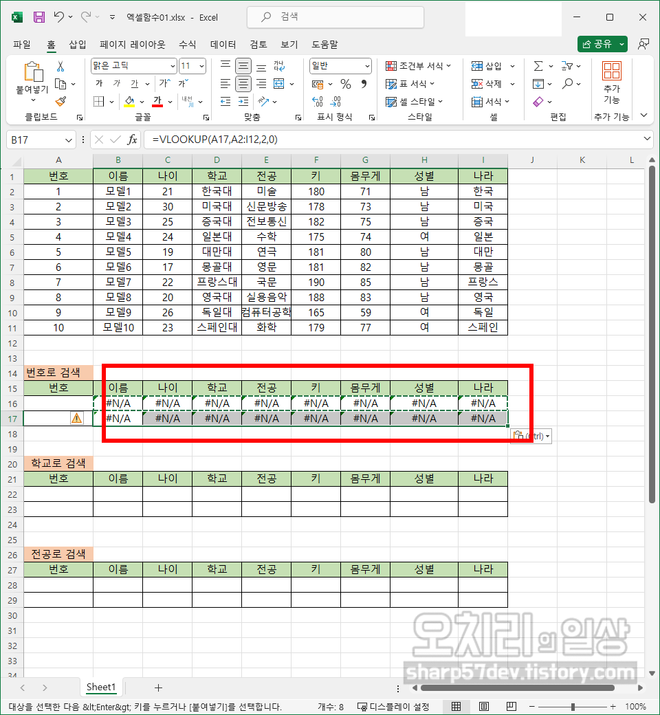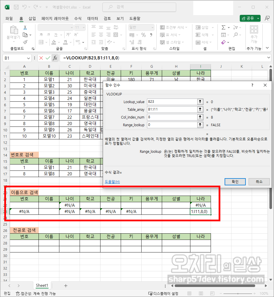그럼 위와 같은 방식으로 이름/나이/학교/전공/키/몸무게/성별/나라칸에도 'VLOOKUP'함수를 사용하여 해당하는 값들을 입력합니다. 여기서의 '키워드'인 '번호'를 입력하기 전까지는 모두 '#N/A'로 표시됩니다.