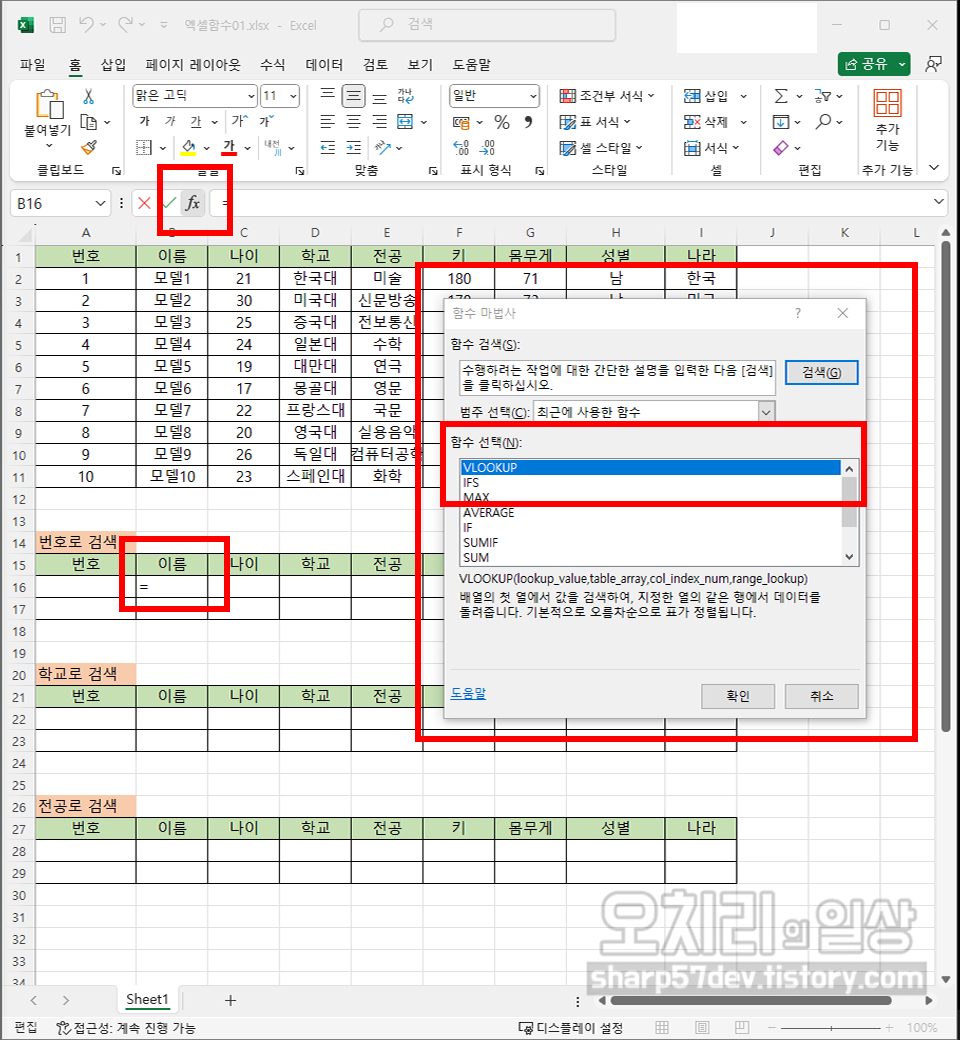 출력할 칸에 마우스 클릭을 하여 포커스를 '이름'에 맞춥니다. 그리고 상단 메뉴 바로 아래 있는 'fx'라는 표시를 클릭합니다. 여기서 'fx'는 수학에서 나오는 '함수'라는 표기랑 같습니다. 이 'fx(함수)'를 클릭하면 '함수 마법사'라는 창이 출력됩니다. 그 '함수 마법사'창의 중간에 '함수 선택'칸에서 'VLOOKUP'이라는 함수를 선택 클릭하고 '확인'버튼을 클릭합니다.