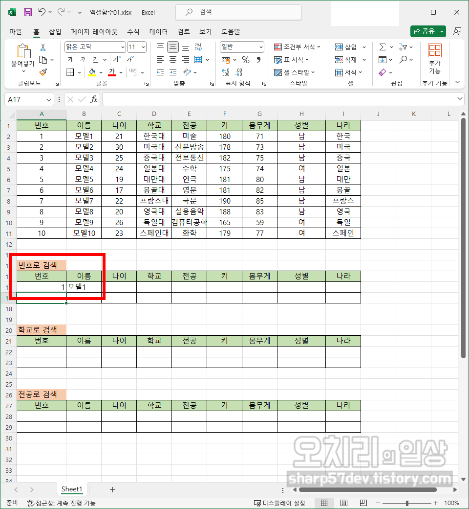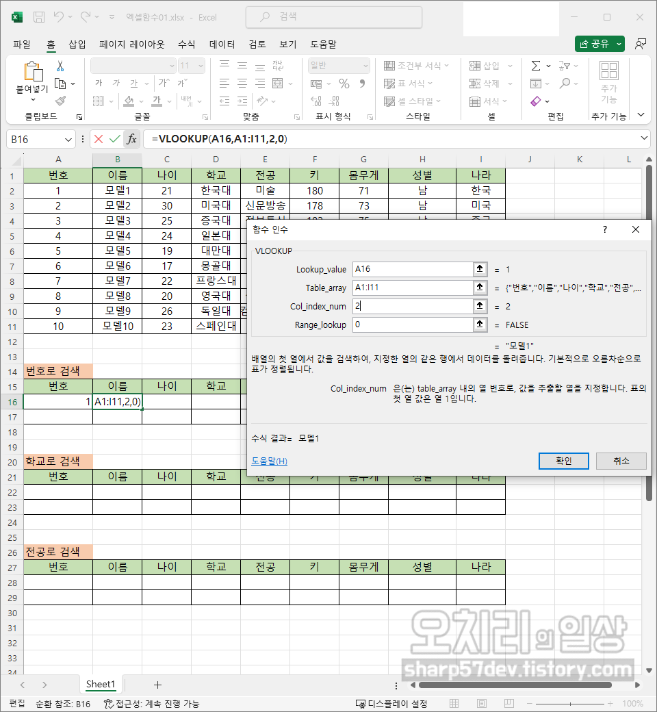 '1'을 입력해 보았습니다. 함수로 만든 'B16'칸에 번호 1에 해당하는 '이름'인 '모델1'이 출력되었습니다.