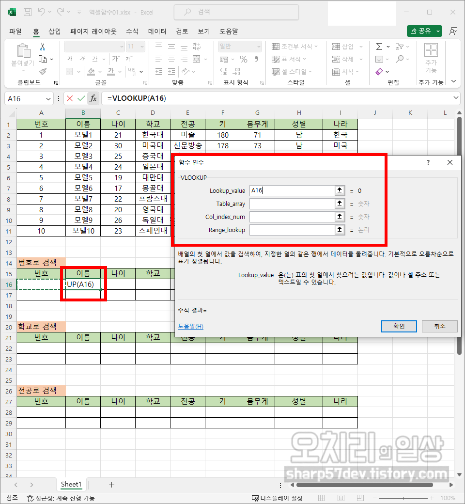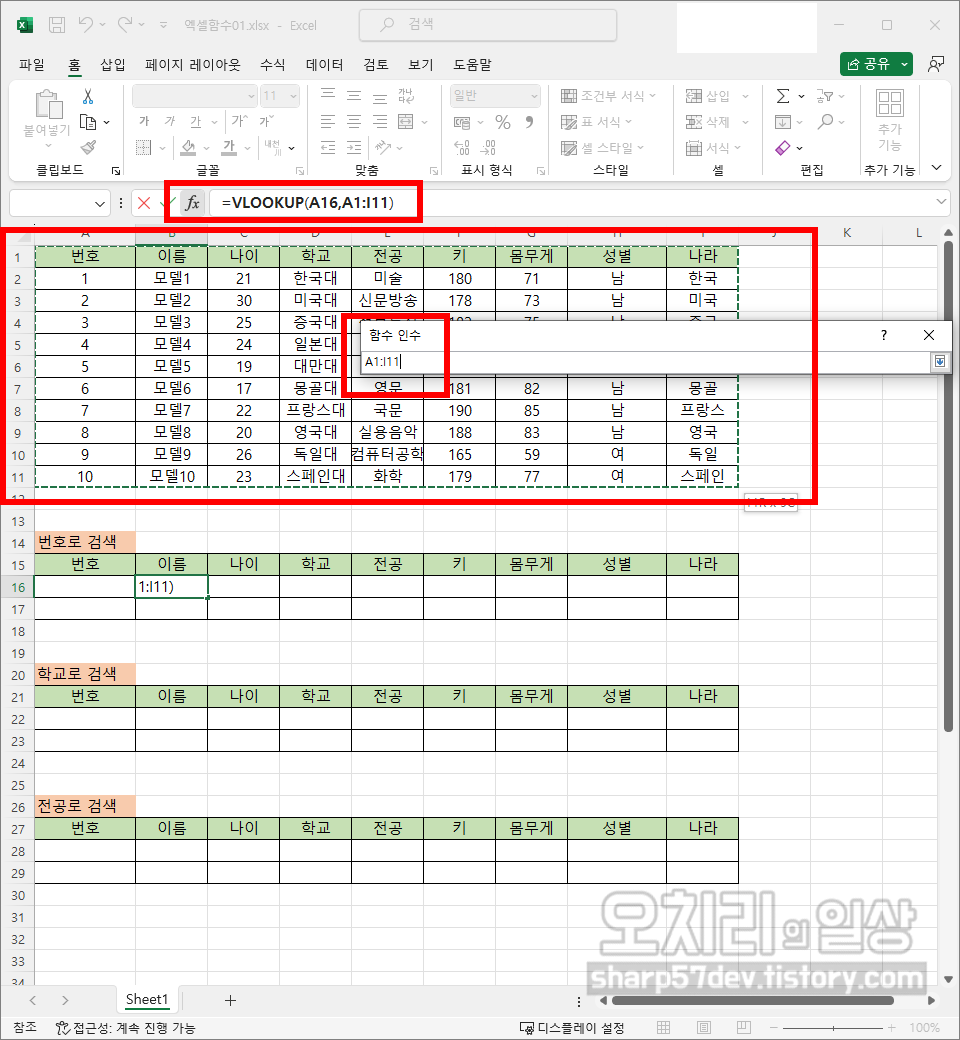 이렇게 '함수 인수'창의 각 칸에 해당하는 값을 넣어줘도 되지만, 엑셀 메뉴 아래 'fx'입력칸에 '=VLOOKUP(A16,A1:I11,2,0)'으로 직접 입력하여도 됩니다.