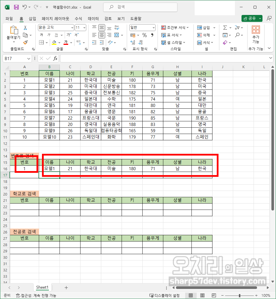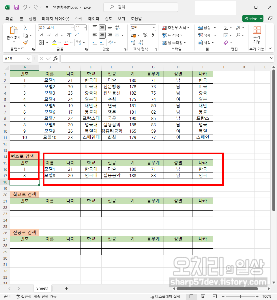'번호'의 순서와 관계없이 '1번, 8번'을 입력하자 그에 해당하는 값들이 16행, 17행에 출력되었습니다.