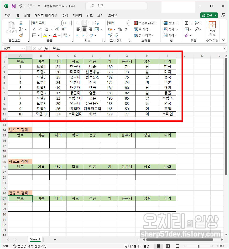일단 자료를 엑셀표로 정리를 해놓았습니다. 번호/이름/나이/학교/전공/키/몸무게/성별/나라 순으로 정리를 했습니다.
