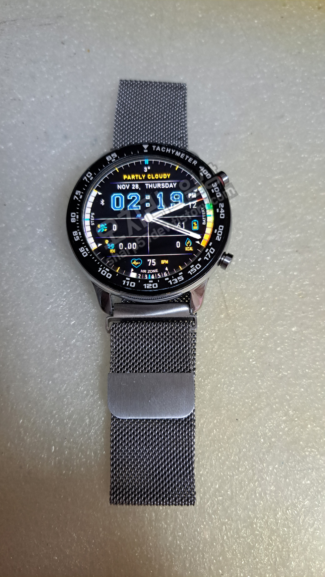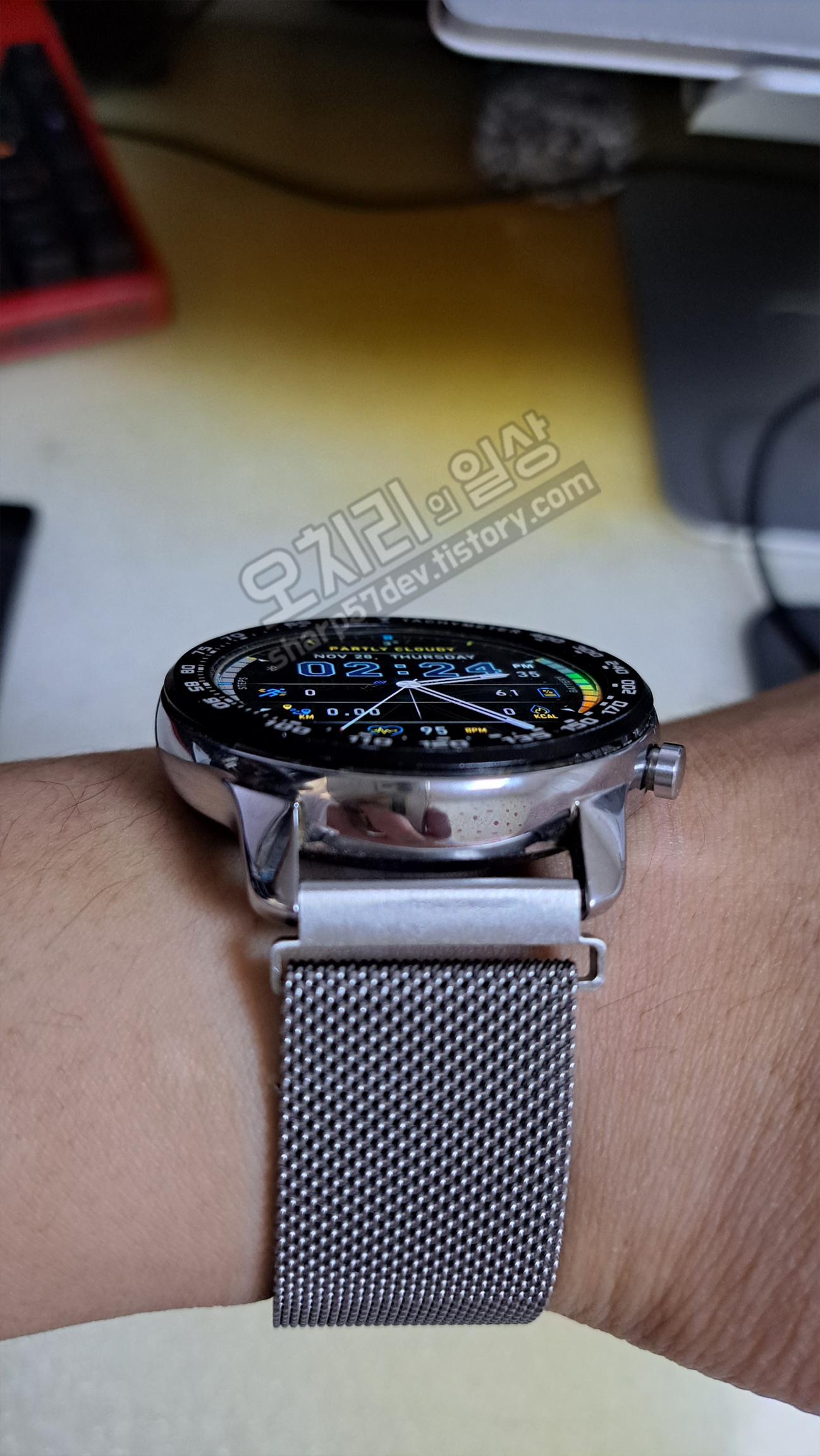 스마트워치에 스트랩을 끼우고 손목에 찬 모습입니다. 메탈 스트랩처럼 무게감이나 볼륨감은 없지만 심플하니 어느 옷걸이에나 어울릴법한 디자인이었습니다. 재질도 메탈 매쉬에 맞게 얇고 가볍기에 땀도 덜 생길 것 같습니다.